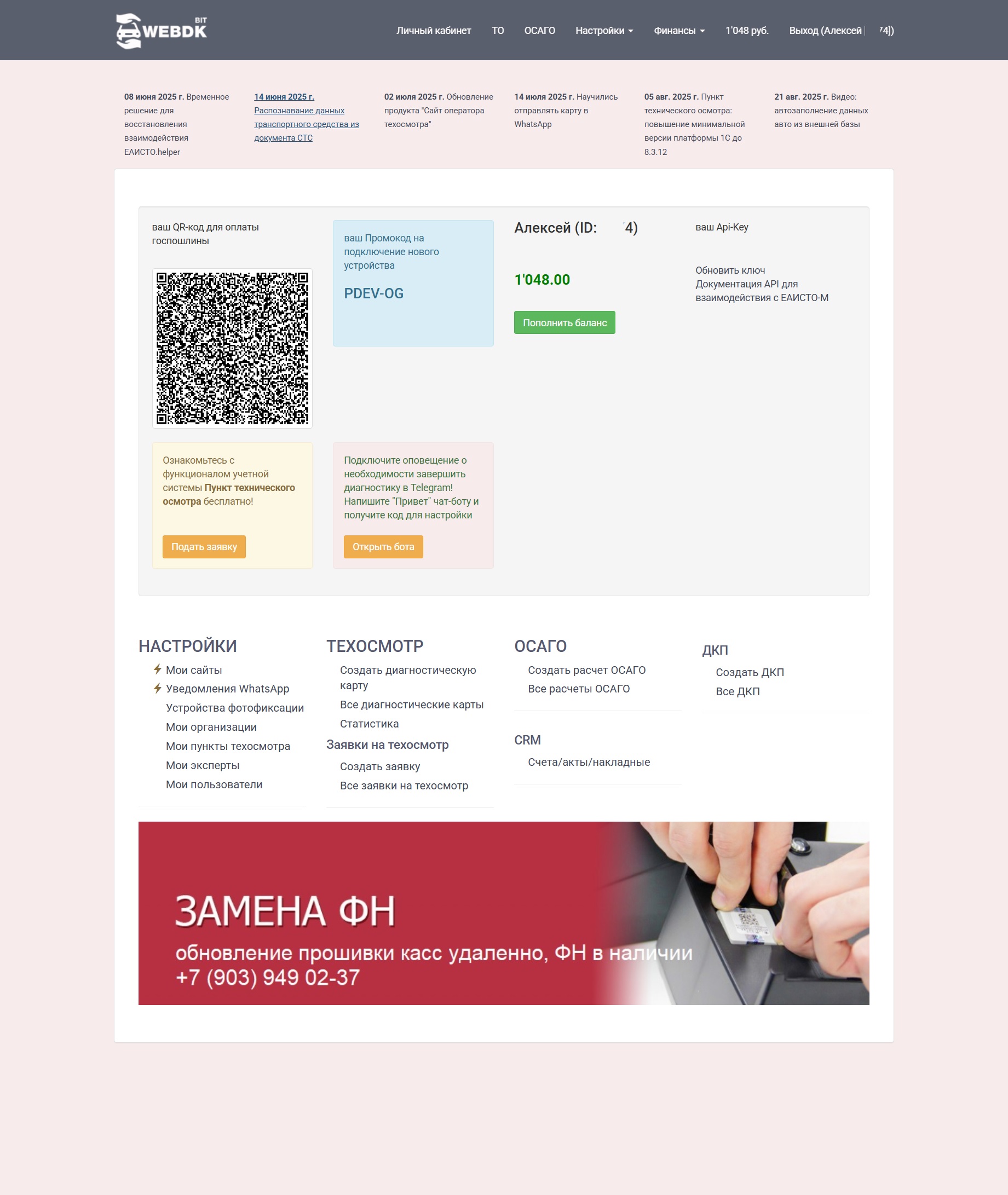 Мы добавили возможность генерировать QR-код для оплаты госпошлины за техосмотр в личный кабинет WEB-DK.RU