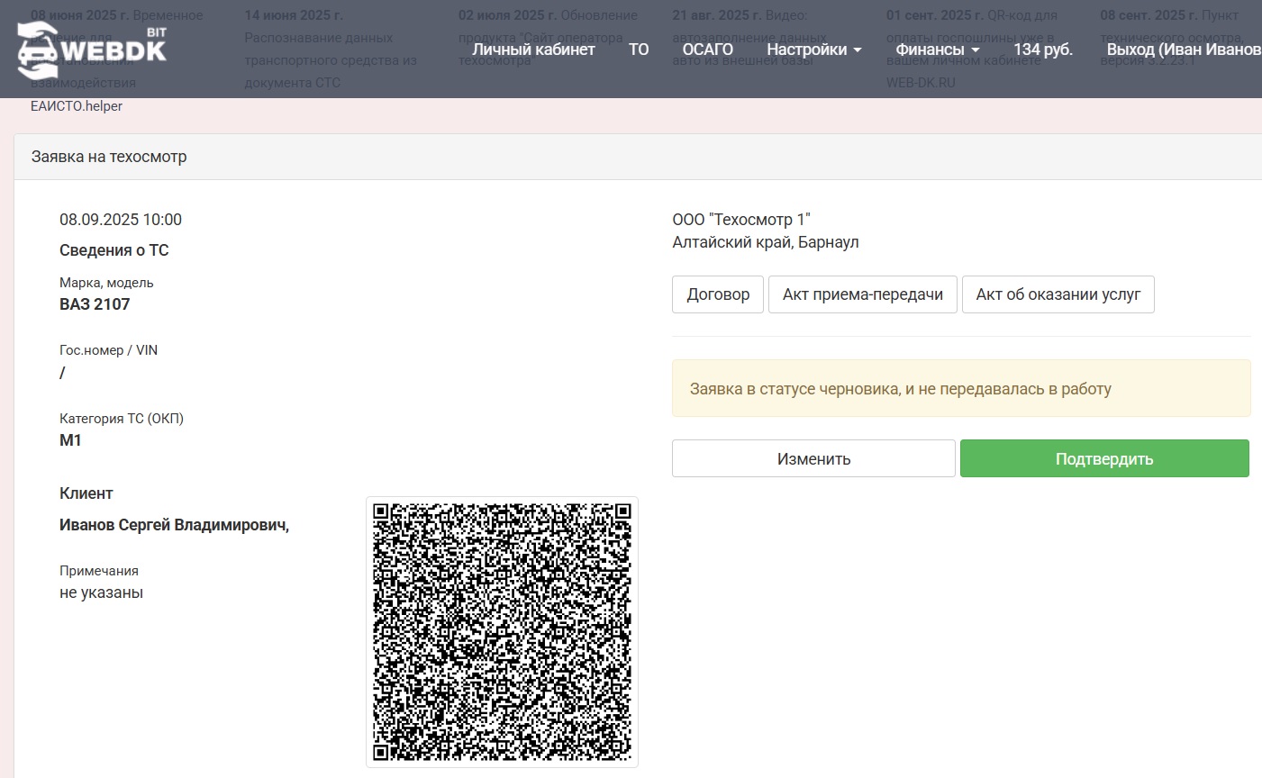 В WEB-DK добавили вывод QR-кода для оплаты госпошлины с данными плательщика в заявку на техосмотр