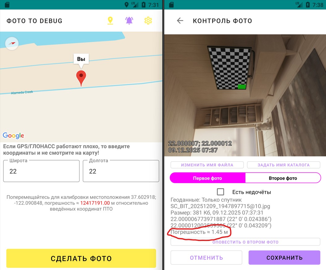 Сигнал GPS во многих регионах работает нестабильно, приходят "мусорные" значения, из-за чего маркер на карте не соответствует действительности, поэтому просто введите точные координаты вашего ПТО, итоговую погрешность, записанную в мета-данные файла, вы увидите на экране предпросмотра, перед сохранением.